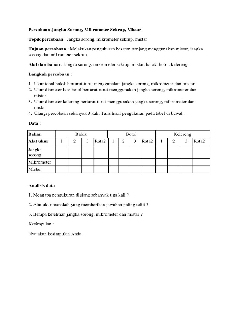 Saat ini, sudah banyak beredar jangka sorong Mikrometer sekrup biasa digunakan untuk mengukur panjang, ketebalan, atau diameter bola dan kawat yang sangat kecil. MAKALAH YANG BERISI TENTANG JANGKA SORONG DAN MIKROMETER SEKRUPFull description. Di bawah ini sudah kami kumpulkan beberapa latihan soal jangka sorong yang dilengkapi dengan jawaban dan pembahasannya.